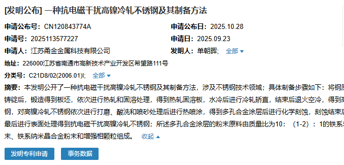 2025年10月28日,江苏甬金金属科技有限公司成功申请一项名为“一种抗电磁干扰高镍冷轧不锈钢及其制备方法”专利,申请公布号为CN120843774A,申请日期为2025年9月23日。