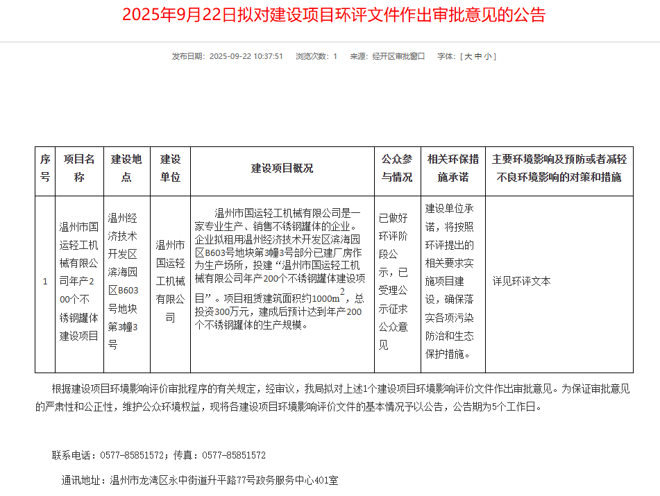 2025年9月22日,温州市生态环境局就温州市国运轻工机械有限公司年产200个不锈钢罐体建设项目环境影响报告表作出审批意见并对外进行公告,公告期:5个工作日。